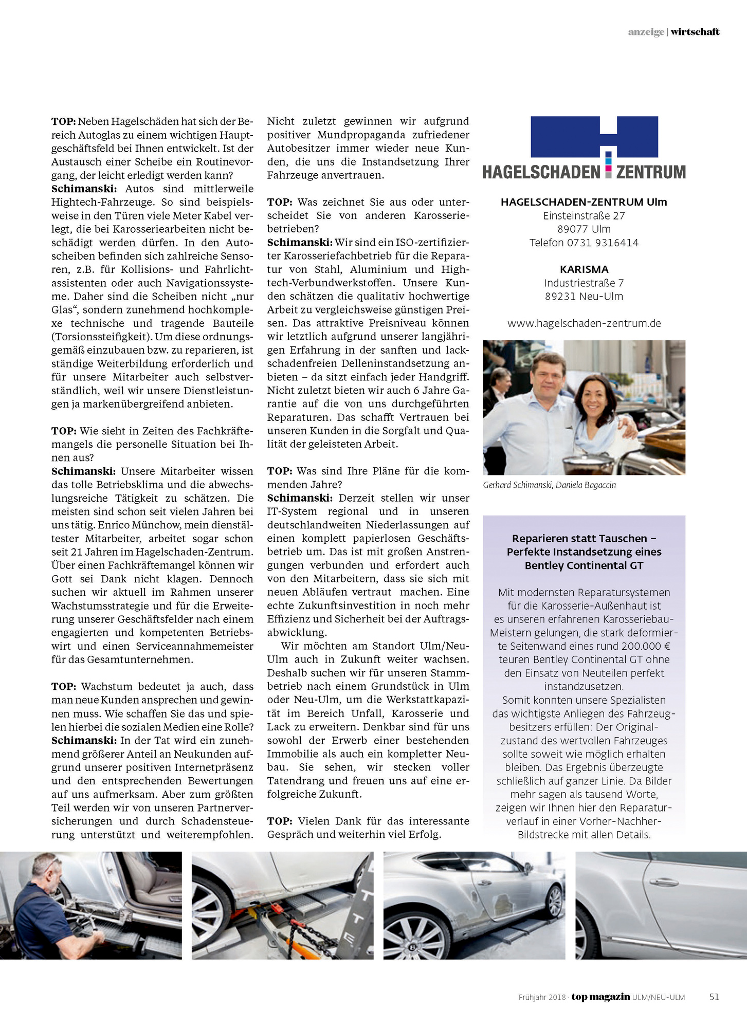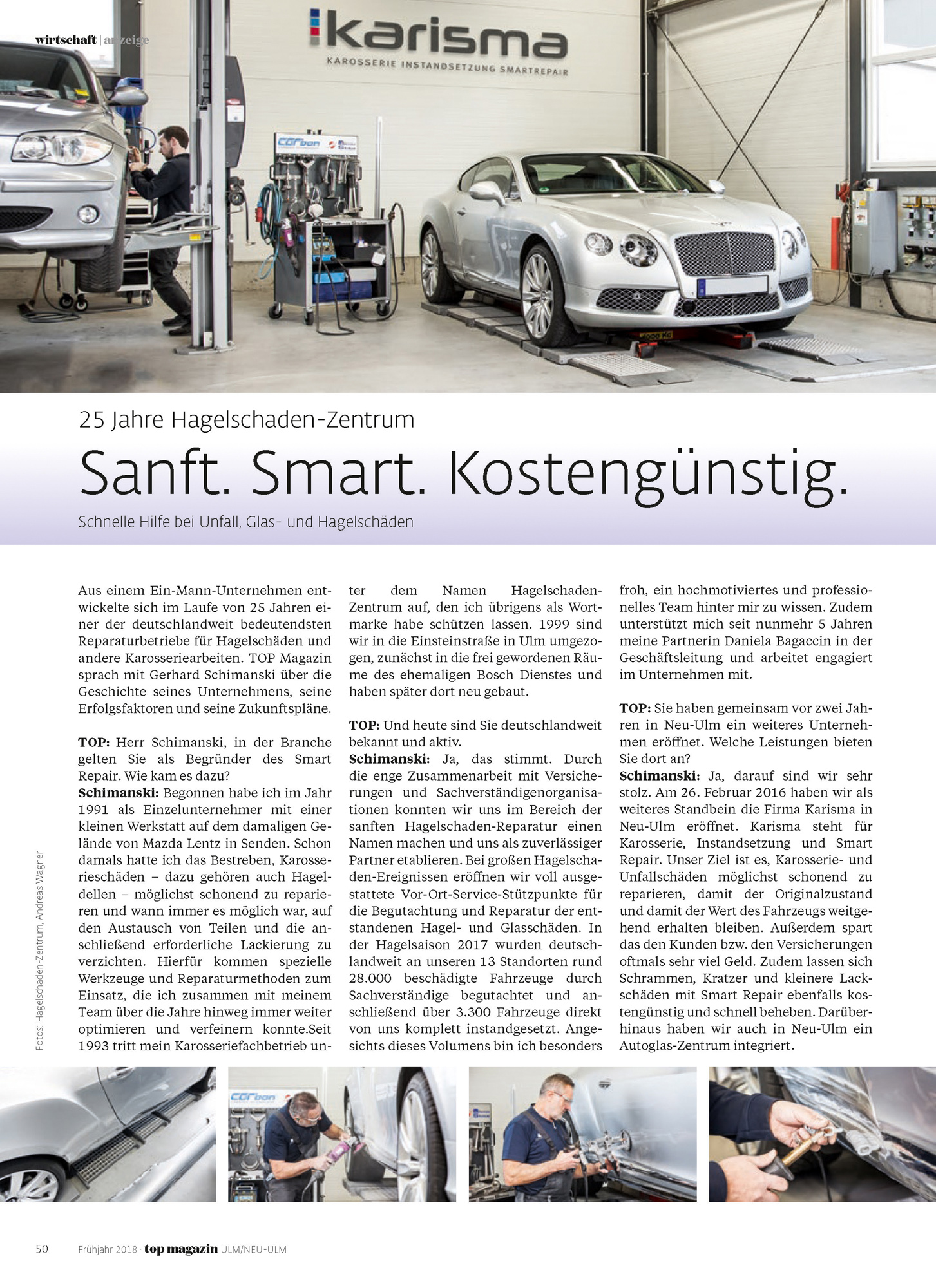 In der Ausgabe 1/2018 veröffentlicht das TOP MAGAZIN ULM unter der Headline „25 Jahre Hagelschaden-Zentrum – Sanft. Smart. Kostengünstig. Schnelle Hilfe bei Unfall, Glas- und Hagelschäden“ ein umfangreiches Interview mit Gerhard Schimanski.
