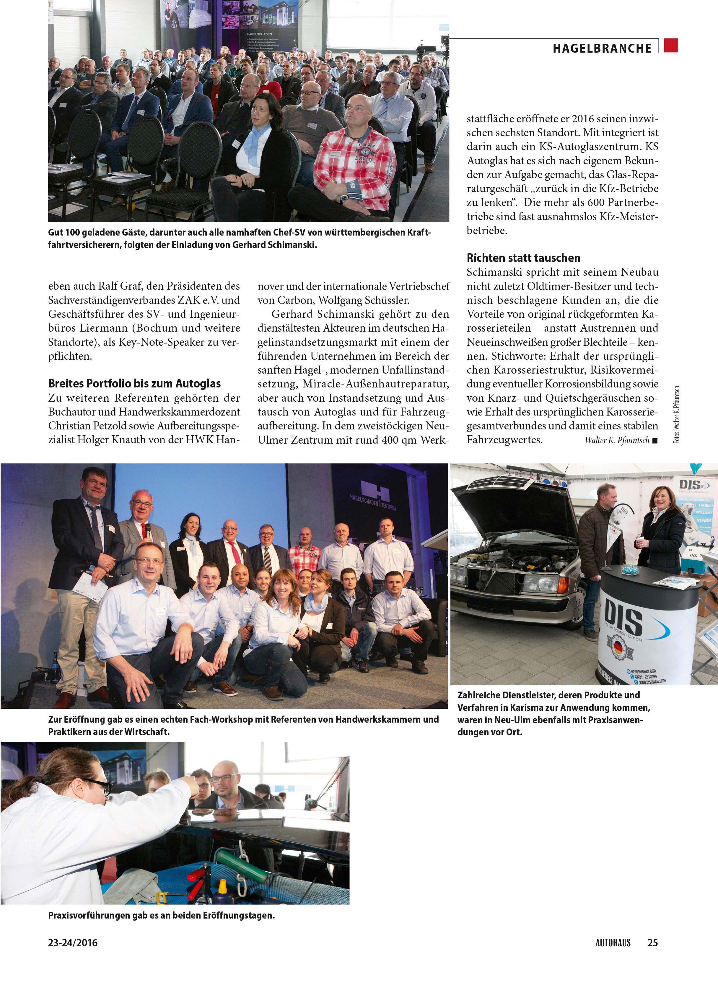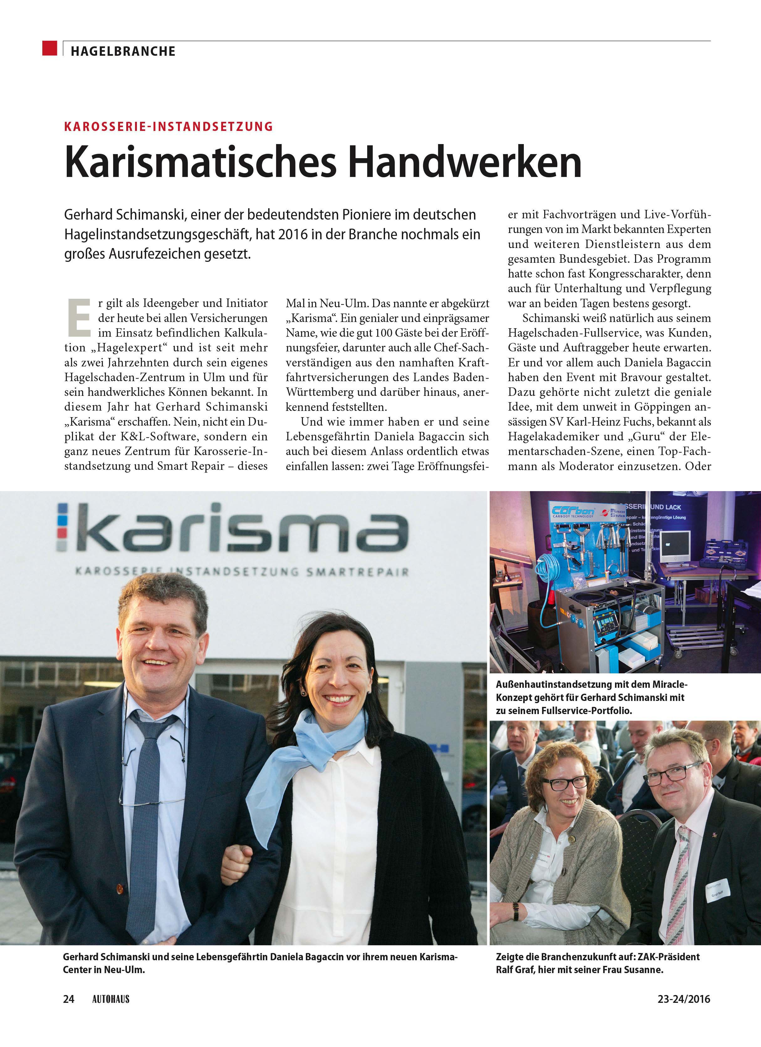 Im Fachmagazin AUTOHAUS in der Rubrik Hagelbranche berichtet Walter K. Pfauntsch in einem umfangreichen Beitrag über karisma Neu-Ulm, das neue Smart Repair Zentrum von Hagel-Pionier Gerhard Schimanski.