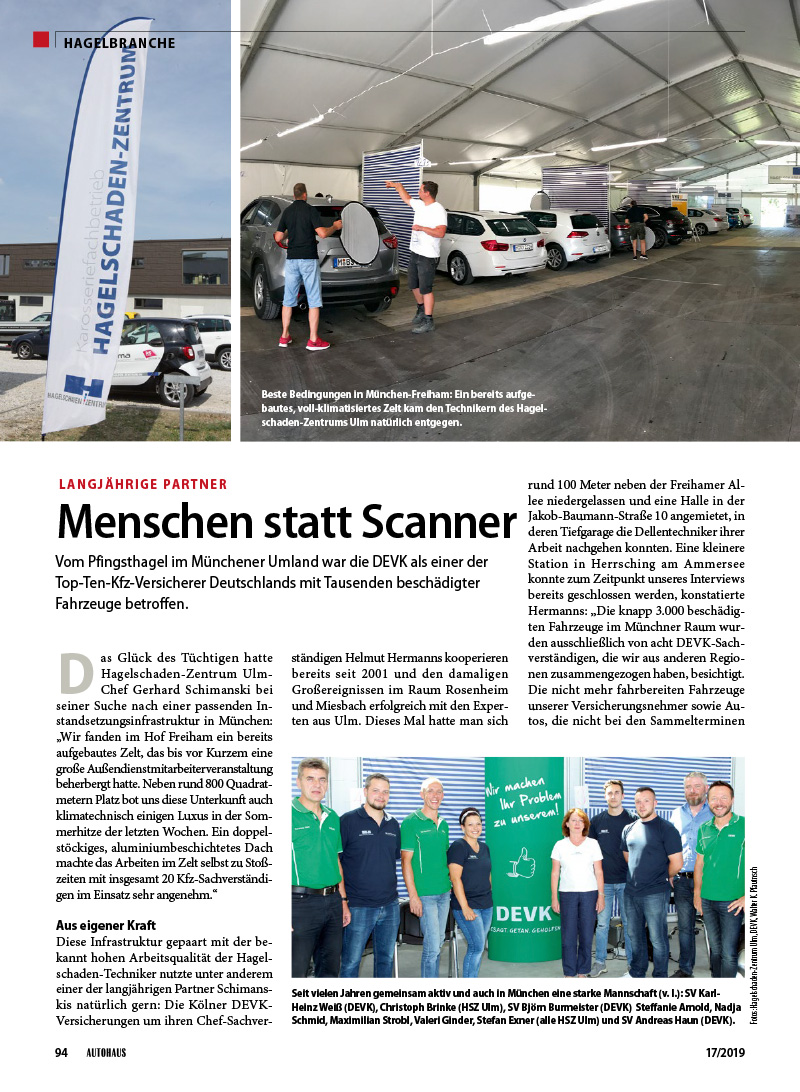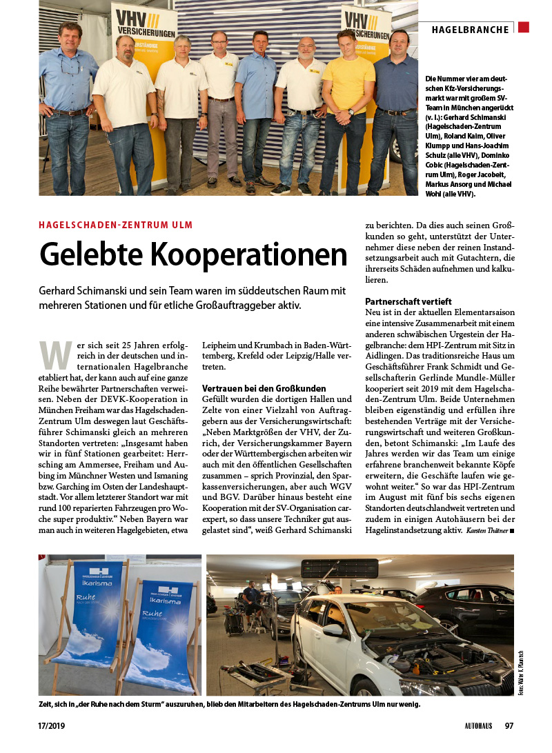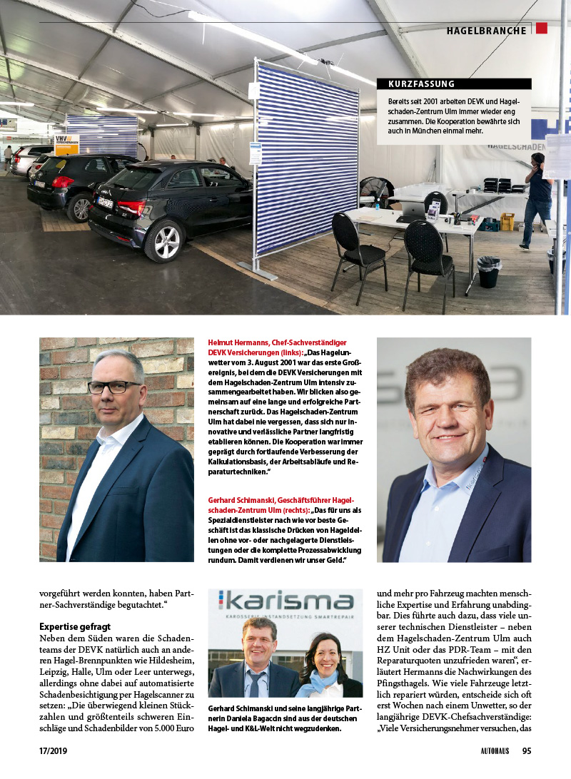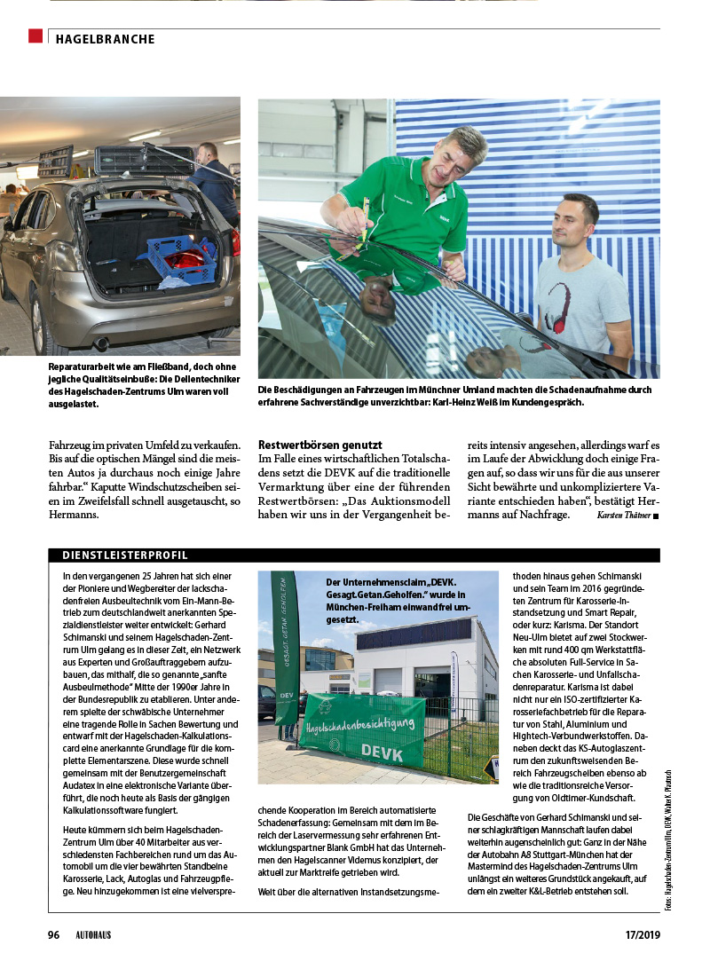 Das AUTOHAUS MAGAZIN veröffentlichte in „Hagel-Branche“ 17/2019 gleich zwei Berichte über den großen Pfingsthagel in Süddeutschland und unsere langjährigen Partnerschaften und gelebten Kooperationen mit der Versicherungswirtschaft vor Ort. (Text: Karsten Thätner / Fotos: Walter K. Pfautnsch, DEVK)